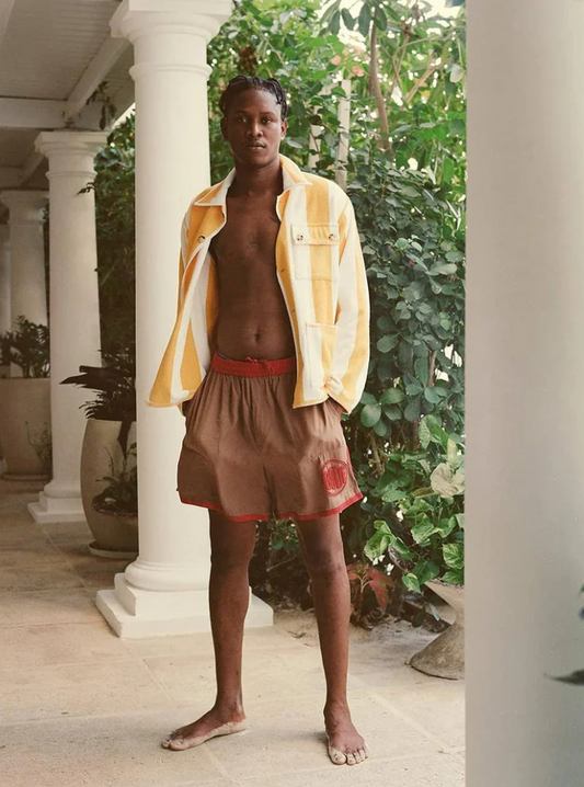 This limited edition Terry cloth beach coverall came out of a Palm Heights uniform collaboration with CFDA winner Emily BODE. It stemmed from the urge to create a piece that both reflects the timeless silhouettes of Emily Bode’s collection and encapsulates elements of Palm Height’s beach estate. This jacket features our upcycled iconic towels used throughout the property. They have been repurposed to create an essential beach garment.