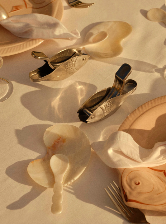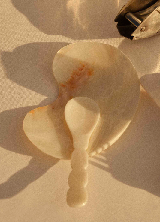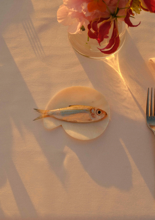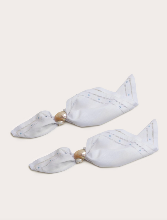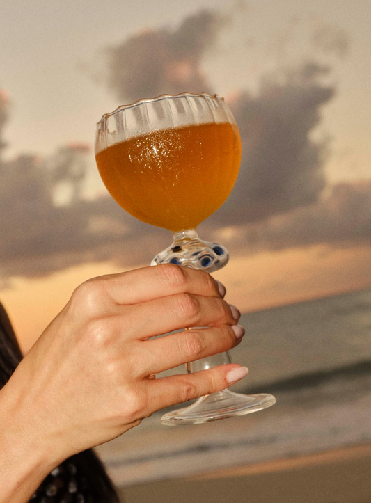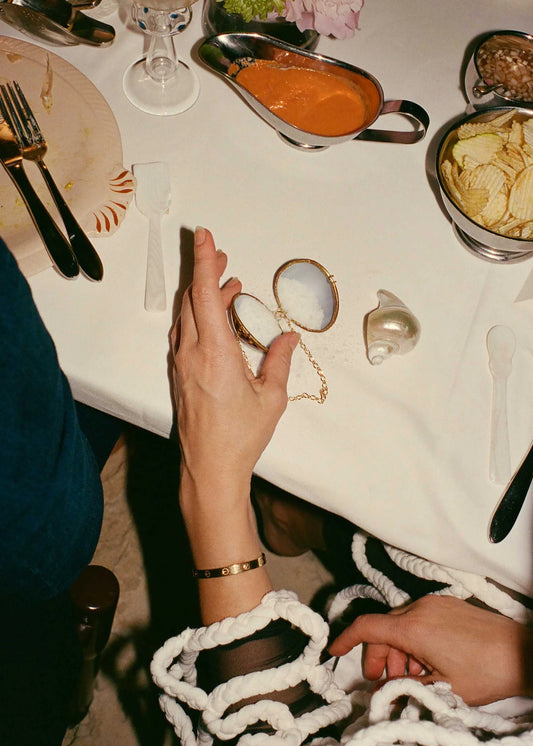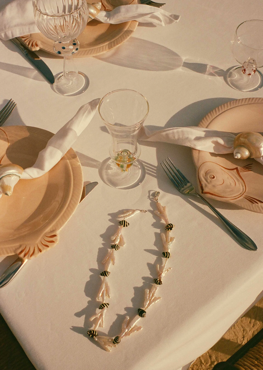 Palm Heights collaborated with Gohar World on an 11-piece capsule. The collection includes Arabesque Glassware, custom made in Egypt with Galerie Alef, seashell Trinket Boxes to accompany the glassware as well as Gohar World’s beloved Chicken Foot Pearl Host Necklace, re-strung to include seashells for a tropical touch.